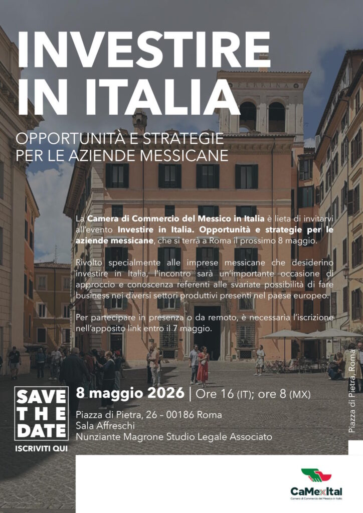L’evento, promosso dalla Camera di Commercio del Messico in Italia, è rivolto alle imprese messicane interessate a esplorare le opportunità nei diversi settori produttivi del Paese.
